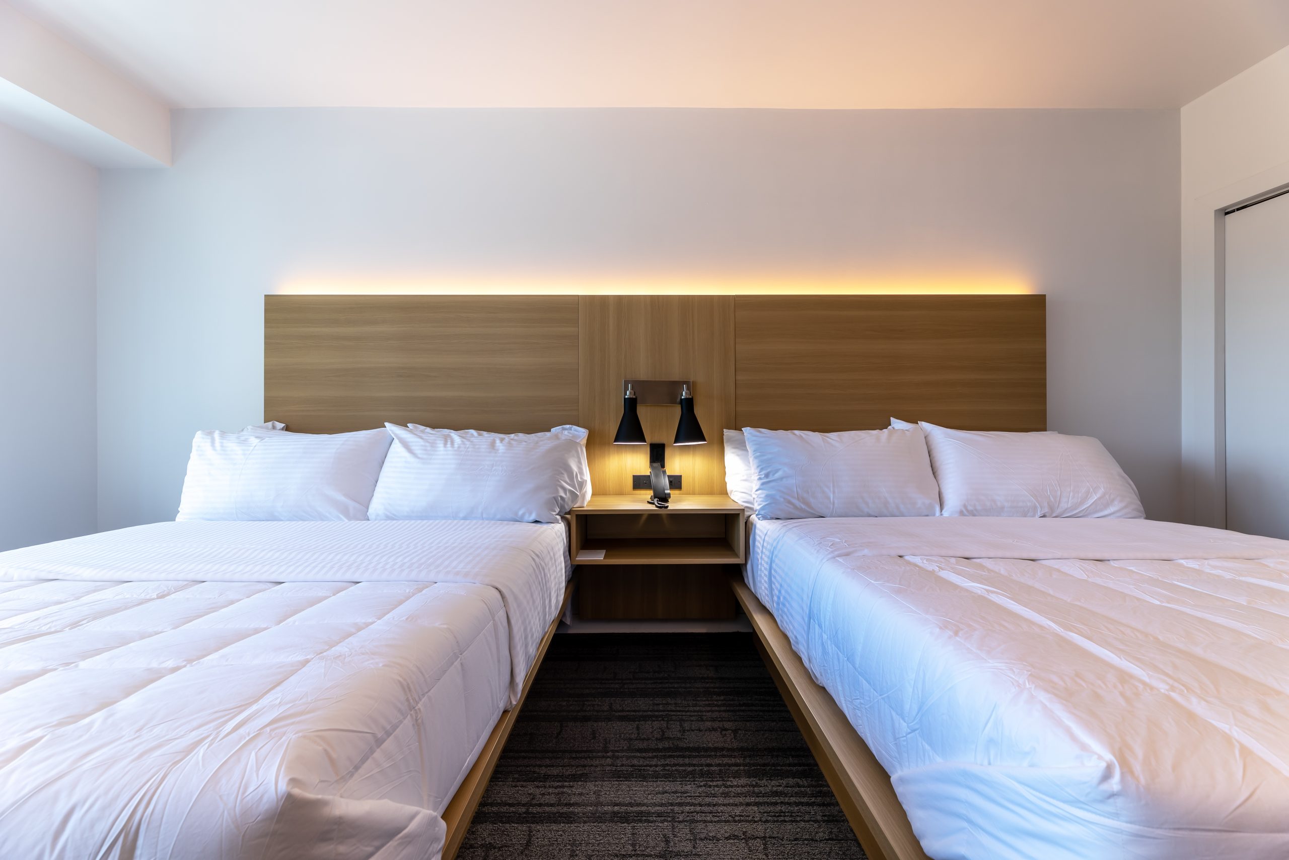Relax in our modern and minimalist Double Queen Room – featuring two queen-sized Leesa mattresses (the best hybrid mattress, according to the NYT), comfortable linens, and a private spa-like bathroom with a Toto heated bidet. This room also offers access to a private balcony overlooking Long Beach Blvd. With large windows and a balcony, this Double Queen Room room is bright and airy, inspiring a feeling of calm and relaxation.